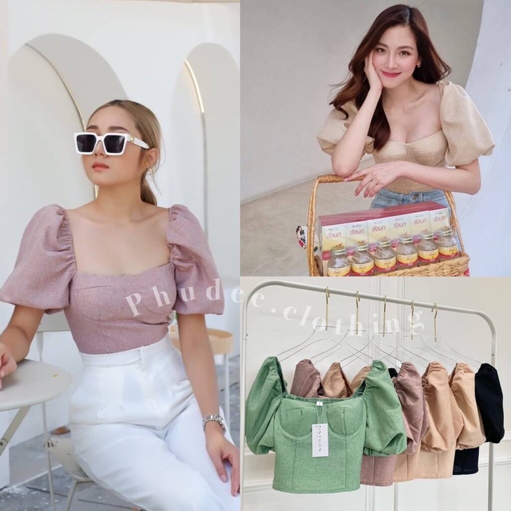 (ตัวสุดท้าย) เสื้อครอปแขนสเมิร์ฟ Tag INTUON✨Wewaขายดี เสื้อครอปแขนตุ๊กตา ชุดไปคาเฟ่ ชุดไปเที่ยว