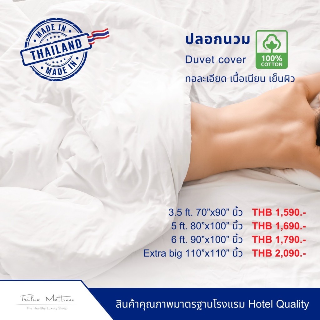 ผ้าคอทต้อน 100% ทอละเอียด เป็นผ้าเกรดเดียวกับที่โรงแรมหรูใช้ เนื้อนุ่ม เย็นผิว ให้ความเป็นมิตรกับผิวเมื่อสัมผัส ไม่ขูดส้นเท้า ไม่ขึ้นเม็ด ยิ่งซักยิ่งนุ่ม ใช้คู่กับปลอกนวมแบบ นุ่ม บาง เบา ให้ความรู้สึกเหมือนได้พักที่โรงแรมหรู ผ้าแนบตัว ไม่ร้อน น้ำหนักดี