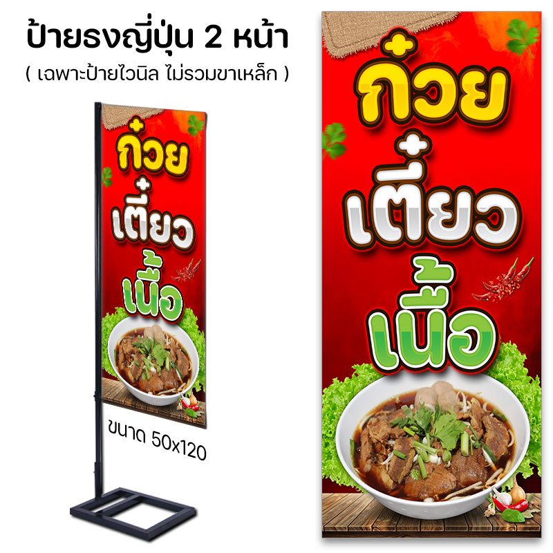ป้ายไวนิล ร้านก๋วยเตี๋ยวเนื้อ เจาะตาไก่ ธงญี่ปุ่น ไวนิลปล่อยขอบ ราคาประหยัด