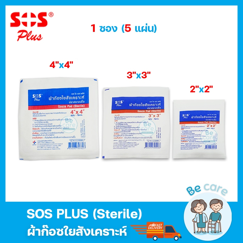 ผ้าก๊อซ gauze pad sterile ผ้าก๊อตปิดแผล SOS Plus ปลอดเชื้อ ฆ่าเชื้อ ขนาด 2x2 นิ้ว, 3x3 นิ้ว และ 4x4 นิ้ว (1ซอง 5 แผ่น)