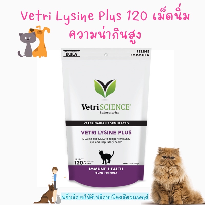 พร้อมส่ง ถูกที่สุด ไลซีนแมว Vetri Science Lysine Plus 120 ชิ้น อาหารเสริม ช่วยกระตุ้นภูมิคุ้มกัน Vetriscience lysine cat