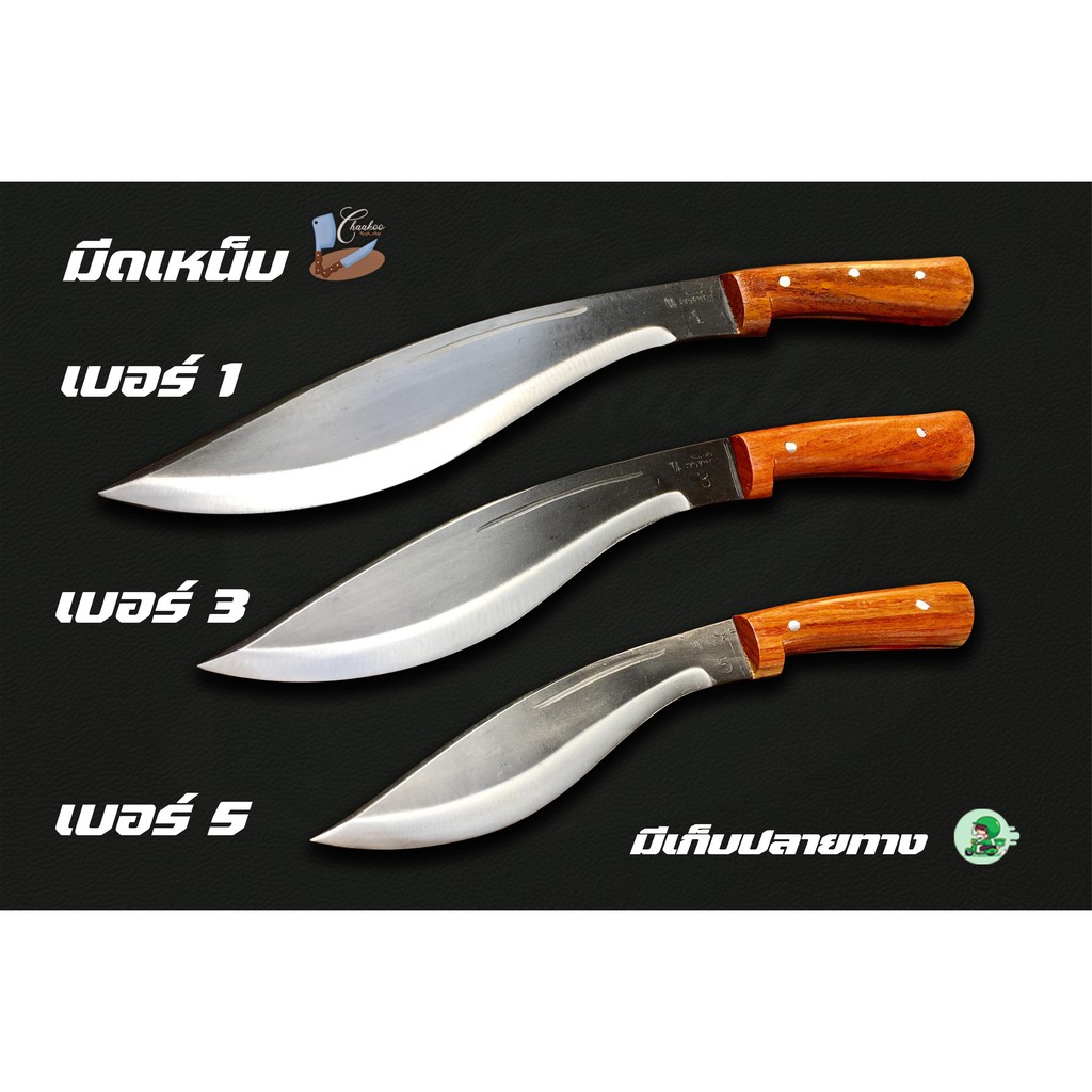 No.1 ความยาวใบมีด 12 นิ้ว ความยาวด้าม 5 นิ้ว ความยาวรวม 17นิ้ว ความหนาใบมีด 4 มิลลิเมตร