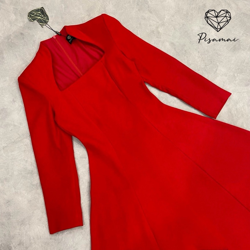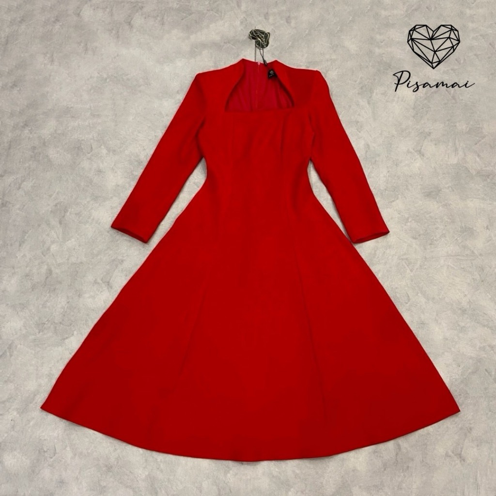 "เช็คสินค้าก่อนสั่งซื้อ สั่งแล้วห้ามยกเลิกน๊าค๊า"PISAMAIเดรสตัวยาวแขนยาวสีแดง ช่วงคอดีไซน์ตัดคอเหลี่ยม มาในทรงกระโปรงบาน