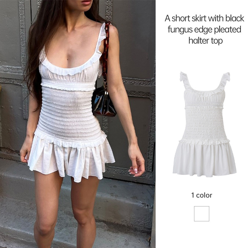 เซ็กซี่คอ U นัวเนียขอบจีบชุด Suspenders ชุดสั้นสีทึบผู้หญิง JD