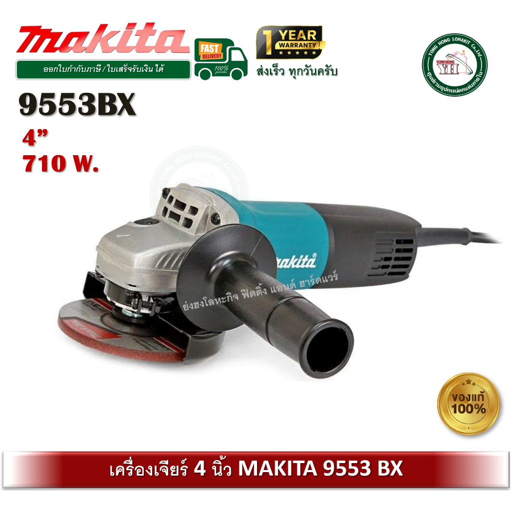 เครื่องเจียหรือที่ช่างนิยมเรียกว่าเครื่องเจียลูกหมู เครื่องเจียไฟฟ้า 4 นิ้ว MAKITA รุ่น 9553BX มีน้ำหนักเพียง 1.7 กิโลกรัม คล่องตัว ใช้งานได้สะดวกมอเตอร์ 710 วัตต์ ความเร็วรอบ 11,000 รอบต่อนาที (RPM) มีสวิตซ์ท้ายตัวเครื่องเปิด-ปิดใช้งานสะดวก มาพร้อมที่บังสะเก็ด เหมาะสำหรับงานเจียตกแต่งผิวโลหะ สามารถใช้ร่วมกับใบเจียหรือใบตัดเพชรขนาด 4 นิ้วได้ ใช้ถ่าน CB-325