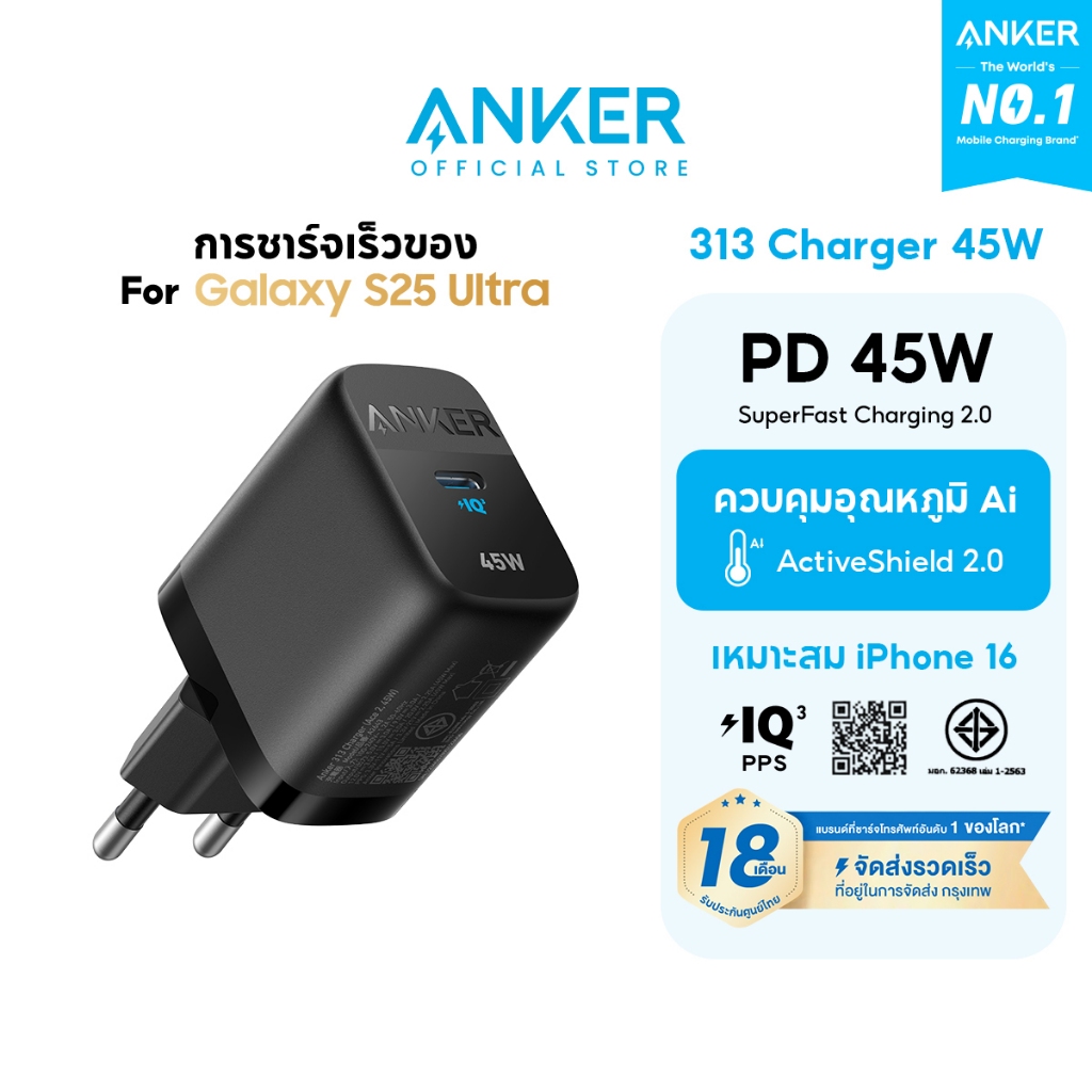 Anker 313 Charger 45W GaN 312 Charger (Ace2, 25W) สำหรับ Samsung Galaxy iPhone 17/16/15 น้ำหนักเบา พกพาง่าย Fast Charger
