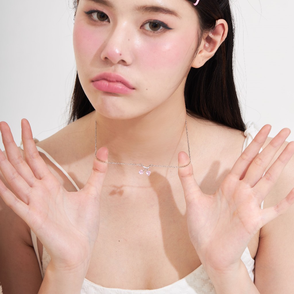 earika.earrings - taffy cherry necklace สร้อยคอจี้รูปเชอร์รี่หัวใจคริสตัลสีชมพูชุบทองคำขาว เหมาะสำหรับคนแพ้ง่าย