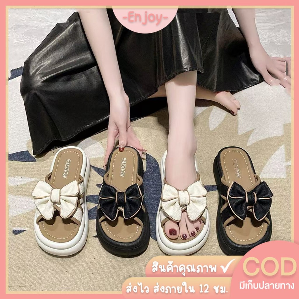 🍓EnJoy🍓 พร้อมส่ง (LT-2605)  รองเท้าแตะแบบสวม ดีเทลโบว์ สไตล์เกาหลี น่ารักๆ นุ่มนิ่มใส่สบาย - รูปที่ 1