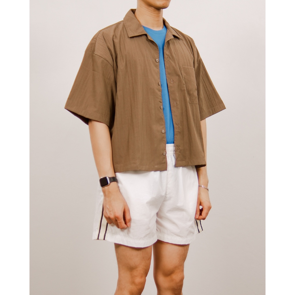 เสื้อเชิ้ตแขนสั้น ทรงครอป ผ้าไนล่อน สีน้ำตาลเข้ม