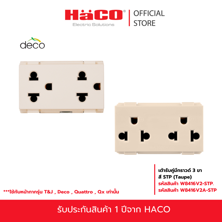 HACO เต้ารับคู่ 3 ขา มีม่านนิรภัย 16 แอมป์ 250 โวลต์ QX สี TAUPE รุ่น W8416V2-STP(แนวนอน) และ W8416V2A-STP (แนวตั้ง)