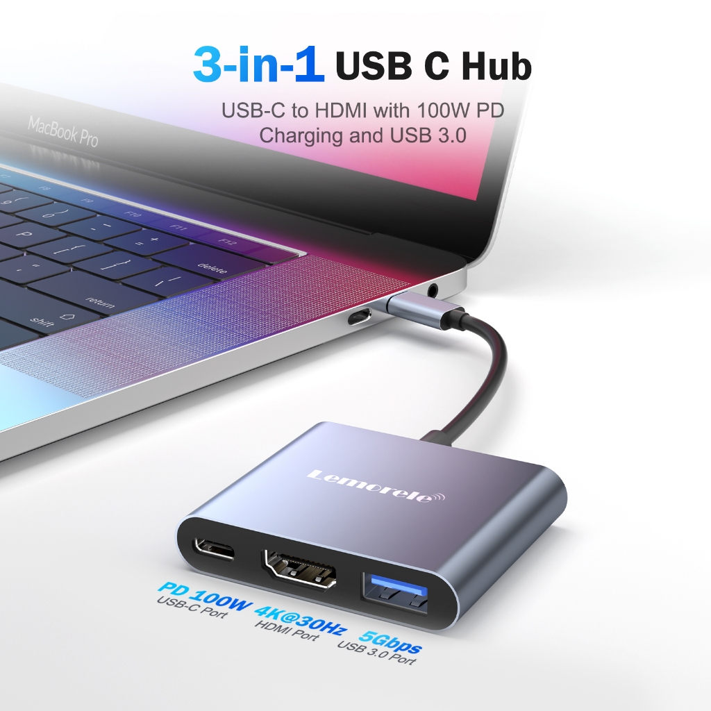 Lemoerle TC33 อะแดปเตอร์ฮับ USB 3-in-1 USB C เป็น HDMI 4K30HZ USB-A5Gbps PD100W Plug and Play