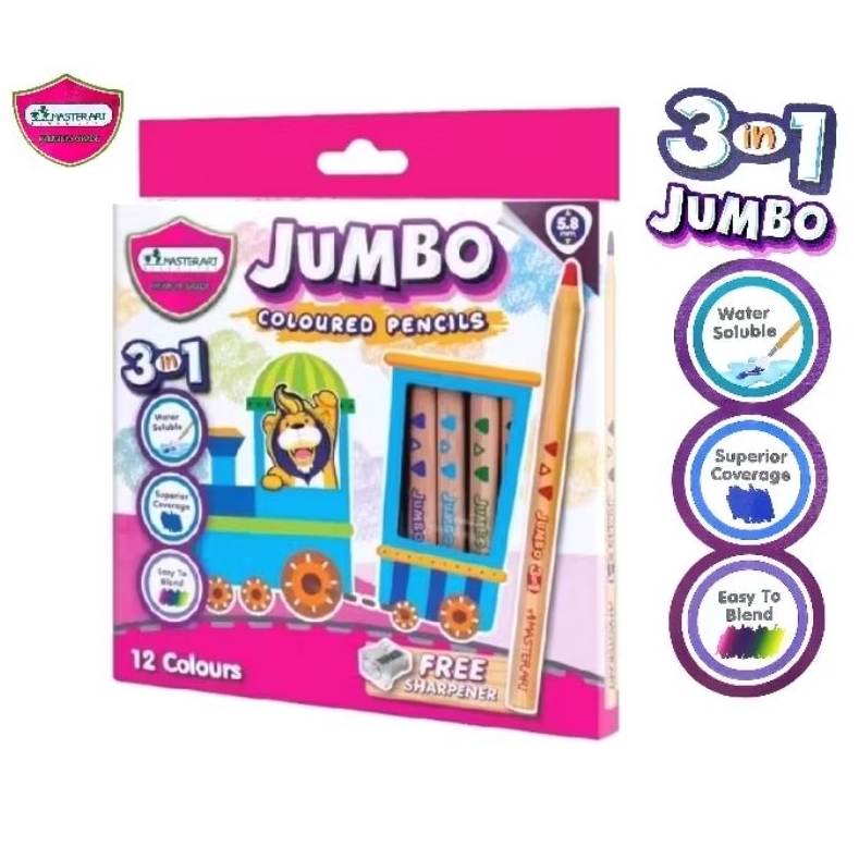 Master Art ดินสอสีไม้จัมโบ้ แท่งยาว 12 สี 3in1 ด้ามจับเป็นไม้ทรงสามเหลี่ยม ใช้เทคนิคระบายสีน้ำได้ ฟรี!!กบเหลาในกล่อง
