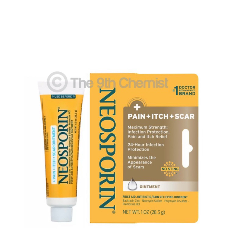 Neosporin Pain, Itch & Scar First Aid Antibiotic Ointment provides 24-hour infection protection and maximum strength itch and pain relief for minor cuts, scrapes, and burns. From the #1 doctor recommended brand, this no-sting, anti-itch formula is made with a unique Heliderm Technology, which provides a nourishing healing environment and minimizes the appearance of scars. Formulated for wound care, this first-aid ointment contains the antibiotics bacitracin zinc, neomycin, and polymyxin B, to help protect against infection. The topical ointment also contains the topical analgesic pramoxine HCl, which provides relief from itchy, painful wounds. To treat minor wounds and help minimize appearance of scars, first clean the affected area. Then apply a small amount of the antibiotic analgesic ointment, equal to the surface area of the tip of a finger, on the affected area one to three times a day. This scar and wound care ointment is great for your home first aid kit.