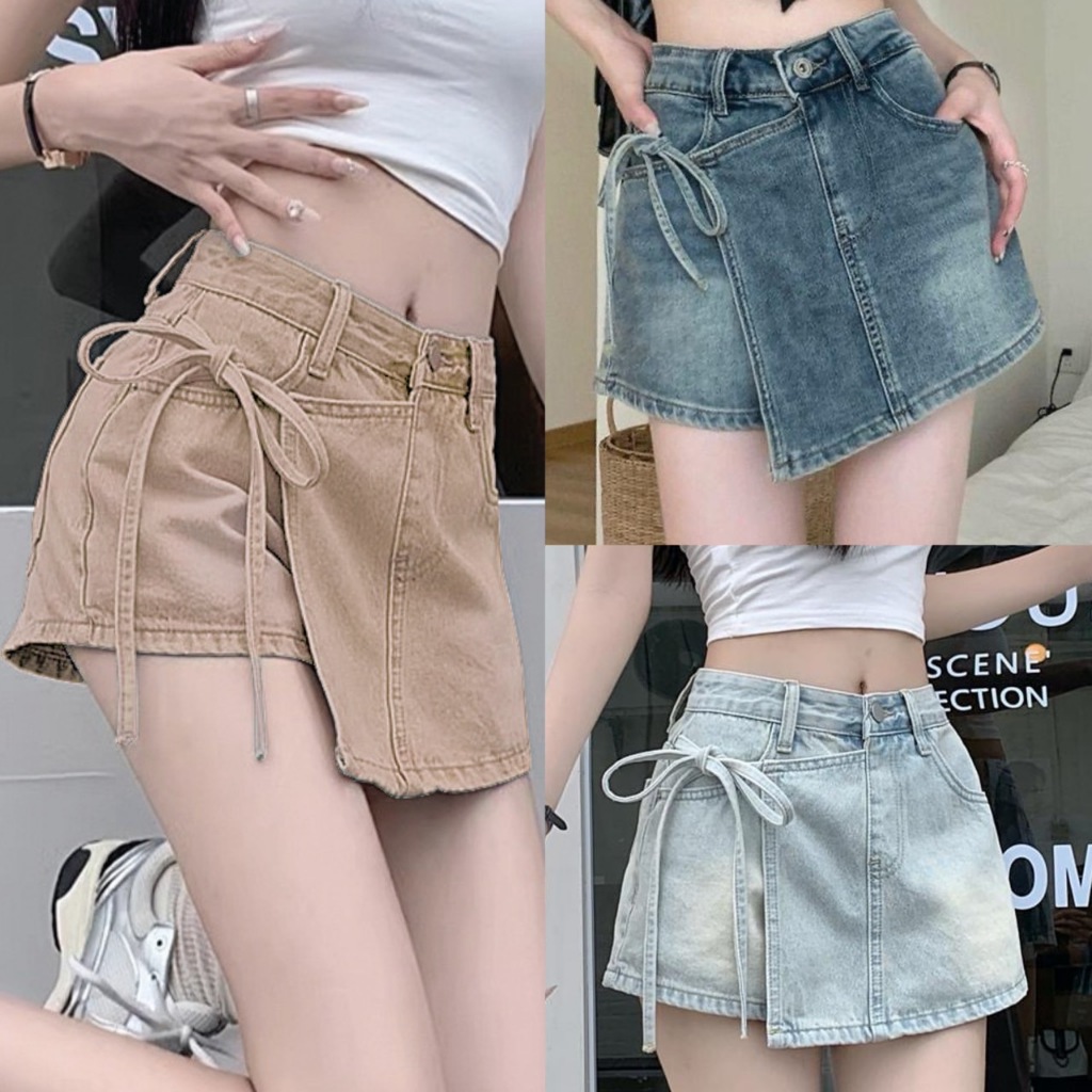 NEWSIZE/S-8XL กระโปรงกางเกงยีนส์ สีฟ้า ตกแต่งผูกโบว์ ดีไซน์น่ารักเกร๋