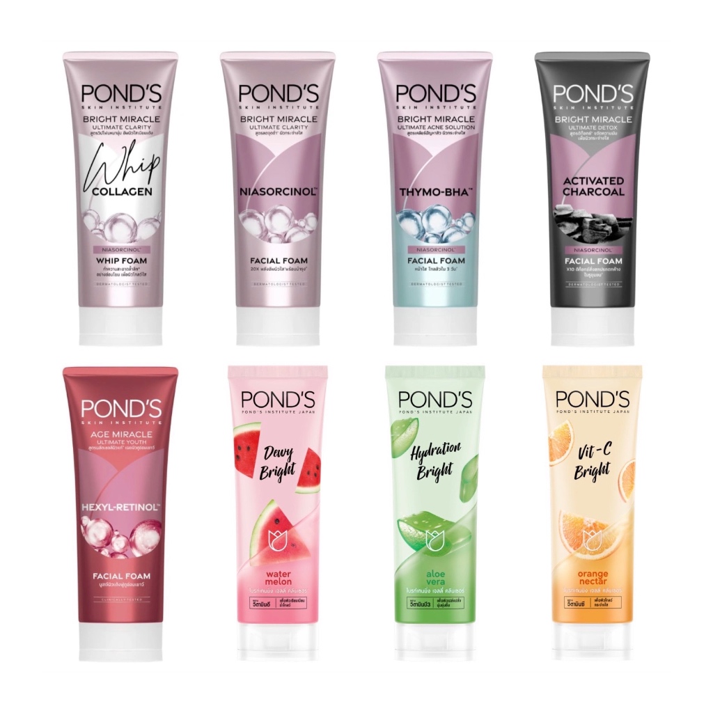 Pond's Age Miracle Facial Foam 100 g. พอนด์ส เอจ มิราเคิล โฟมล้างหน้า ทำความสะอาดผิวหน้า ผลัดเซลล์ผิว 100 ก. พอนด์ส เอจ มิราเคล เฟเชียล โฟม 100 กรัมโฟมล้างหน้าเพื่อผิวอ่อนวัย ช่วยลดเลือนริ้วรอยแห่งวัยด้วยการผลัดผิวชั้นนอกที่เสื่อมสภาพอย่างอ่อนโยนส่วนผสมพิเศษ Intelligent Pro-Cell Complex™ประกอบไปด้วย CLA4 สุดล้ำ และ Retinol Boosters ที่จะช่วยเร่งกระบวนการผลัดเซลล์ผิว พร้อมคืนชีวิตใหม่ให้กับผิวของคุณจากภายในเสริมความเปล่งประกายให้กับผิว พร้อมๆ ไปกับการลดเส้นริ้วและรอยเหี่ยวย่นของคุณ พอนด์ส เอจ มิราเคิล พร้อม Intelligent Pro-Cell Complex™ มากับส่วนผสมพิเศษที่จะช่วยกระตุ้นขั้นตอนการผลิตคอลลาเจน พร้อมๆ ไปกับการดูแลไม่ให้ผิวแห้งกร้าน เสริมพลังในการผลัดเซลล์ผิวใหม่ให้กับผิวของคุณได้มากขึ้นถึง 3 เท่า Pond's bright beauty facial foam 100 g. พอนด์ส ไบรท์ บิวตี้ โฟมล้างหน้า ผิวกระจ่างใส ลดจุดดำ 100 ก. พอนด์ส ไบรท์ บิวตี้ เฟเชียล โฟมโฟมล้างหน้า ขจัดเซลล์ผิวเก่า เผยผิวโกลว์ใสอีกขั้นของนวัตกรรมของโฟมล้างหน้าพอนด์ส ที่ผสานเทคโนโลยีเอ็กซ์โฟลิเอทติ้ง เข้ากับ 4D ไฮยาลูรอนิค เอซิด คอมเพล็กซ์, สารสกัดจากโรสฮิป และวิตามินบี 3+ ช่วยขจัดเซลล์ผิวเก่าสะสมนับล้านอย่างอ่อนโยน ลดเลือนจุดด่างดำที่เกิดขึ้นในชั้นผิว* เผยผิวโกลว์ กระจ่างใสอันเพอร์เฟคของคุณทุกครั้งที่ล้างโฟมล้างหน้า พอนด์ส ไบรท์ บิวตี้ โฟมผลัดผิว เผยผิวสะอาดกระจ่างใส ลดจุดดำ ทำความสะอาดผิวหน้าหมดจด ช่วยขจัดเซลล์ผิว*เสื่อมสภาพและหมองคล้ำ เผยผิวดูกระจ่างใสเปล่งประกายวิธีใช้: บีบโฟม ผสมกับน้ำเล็กน้อยให้เกิดฟอง ลูบไล้ และนวดเบาๆให้ทั่วทั้งใบหน้า และลำคอ แล้วล้างออกด้วยน้ำสะอาด Pond's pure bright facial foam 100 g. พอนด์ส เพียว ไบรท์ โฟมล้างหน้า ทำความสะอาดล้ำลึก ถึงรูขุมขน 100 กรัม โฟมล้างหน้า ขจัดสิ่งสกปรกและมลภาวะ มีส่วนผสมของ แอ็คทิเวตเท็ด คาร์บอน ซึ่งมีคุณสมบัติช่วยดูดซับสิ่งสกปรก และมลภาวะตกค้าง* ให้ผิวดูสะอาดกระจ่างใสใช้ได้กับทุกสภาพผิว Pond's acne clear facial foam 100 g. พอนด์ส แอคเน่ เคลียร์ โฟมล้างหน้า ลดปัญหาสิวและผิวมัน 100 ก. โฟมล้างหน้าลดปัญหาสิวและผิวมัน ผ่านการพิสูจน์ทางคลินิกแล้วว่าเคลียร์ปัญหาสิวได้ใน 3 วัน ครั้งแรกในโลกกับเทคโนโลยี ไทมอล-ที ล็อกแอนด์เคลียร์ เอกสิทธิ์เฉพาะของพอนด์สที่เข้าล็อกแบคทีเรียและเคลียร์ออกทันที่เพื่อประสิทธิภาพสูงสุด