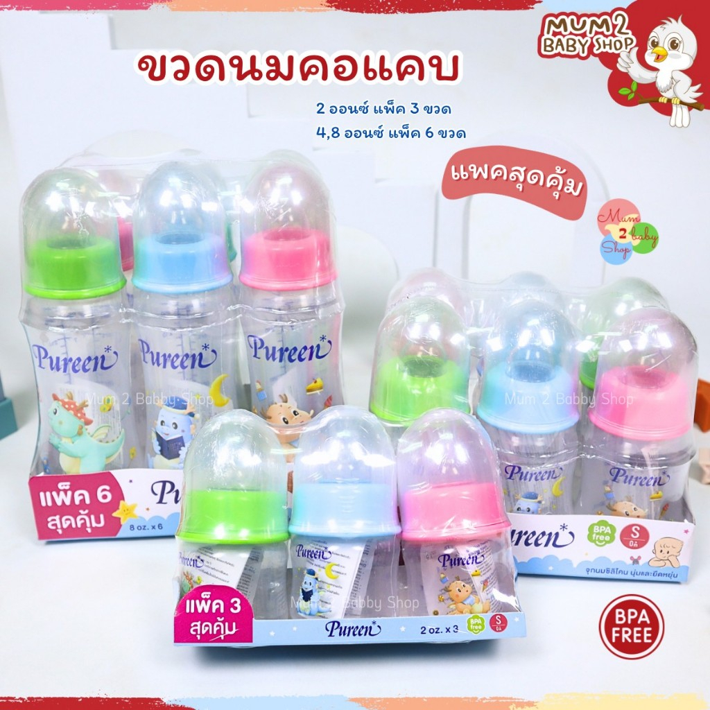 Pureen เพียวรีน ขวดนมเด็กยกแพ็ค ขวดนม คอแคบ 2ออนซ์,4ออนซ์,8ออนซ์ แถมฟรีจุกนมทุกขวด