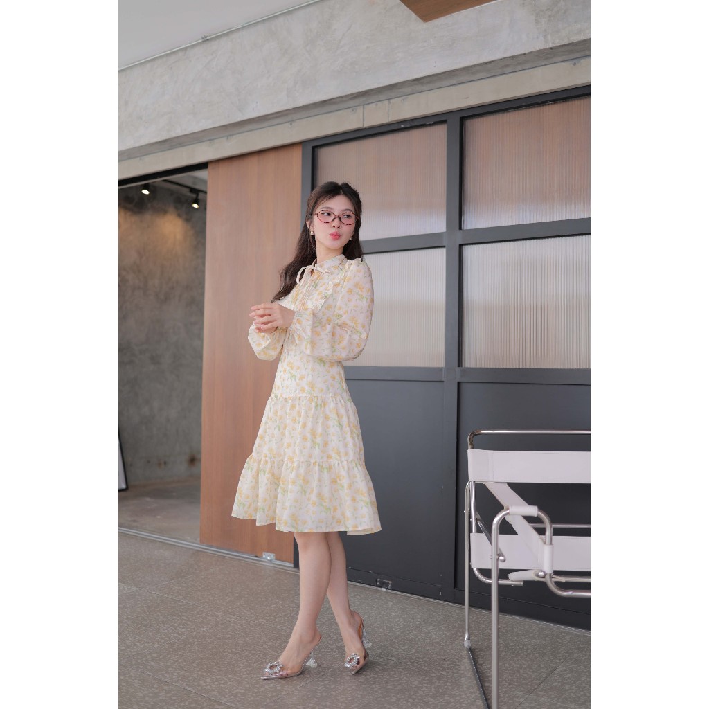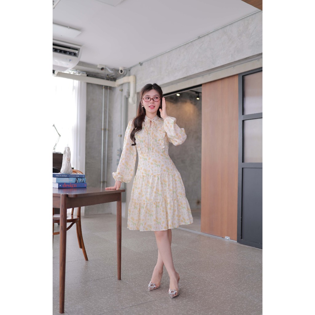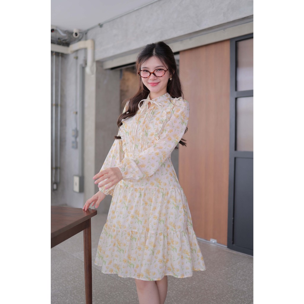 "Romi"Oil" Maribelle Dress K255 ชุดเดรสสีเหลือง (แขนยาวลายดอกมีเชือกผูกคอ)