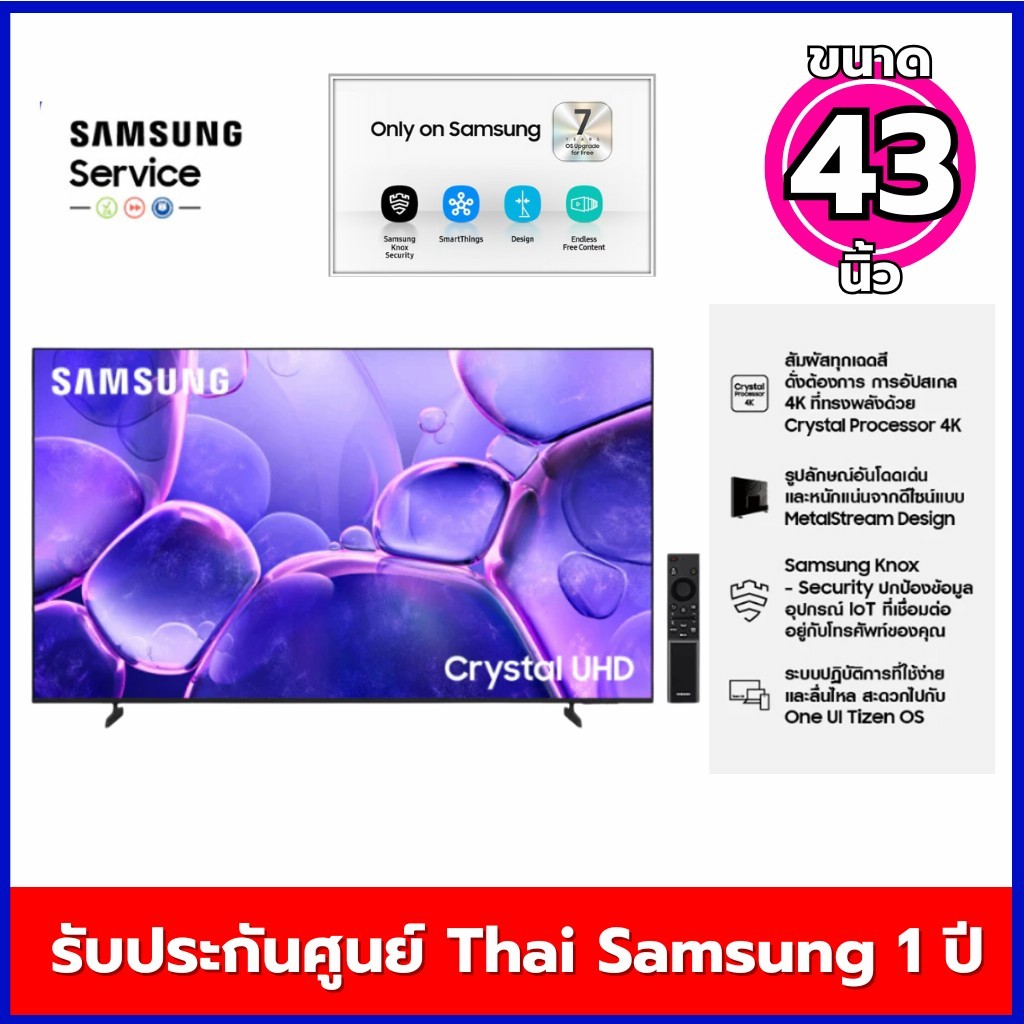 ทีวีแอลอีดี 43 นิ้ว SAMSUNG (4K, LED, TIZEN) UA43UE100FKXXT เปิดประสบการณ์สีสันที่สมจริง พร้อมความคมชัดระดับ 4K บนทีวีแอลอีดี จาก SAMSUNG มอบเฉดสีที่สดใส สมจริง มีชีวิตชีวา ให้ทุกภาพยนตร์ ซีรีส์ หรือเกมโปรดของคุณสวยงามกว่าที่เคยด้วยเทคโนโลยี Dynamic Crystal Color เติมเต็มความสง่างามให้กับห้องของคุณด้วยดีไซน์แบบ MetalStream Design ที่โดดเด่นและหนักแน่น ลงตัวกับทุกสไตล์การตกแต่ง คุณสมบัติ - สัมผัสทุกเฉดสีดั่งต้องการ การอัปสเกล 4K ที่ทรงพลังด้วย Crystal Processor 4K - รูปลักษณ์อันโดดเด่นและหนักแน่นจากดีไซน์แบบ MetalStream Design - Samsung Knox Security ปกป้องข้อมูลอุปกรณ์ IoT ที่เชื่อมต่ออยู่กับโทรศัพท์ของคุณด้วยระบบความปลอดภัยหลายชั้นเฉพาะใน Samsung - อัปเดต Software ระบบด้วย Tizen OS ฟรียาวนานถึง 7 ปี - ภาพคมชัดด้วยความละเอียดระดับ 4K (3,840 x 2,160) - ภาพลื่นไหลด้วยค่า Refresh Rate 60 Hz เพลิดเพลินกับการภาพเคลื่อนไหวอันราบรื่น - สีสดสมจริงด้วยเทคโนโลยี Dynamic Crystal Color พร้อมทั้งเทคโนโลยี HDR - Contrast Enhancer เพิ่มความมิติและสีสันให้ดีขึ้นเพื่อให้เหมาะสมกับเนื้อหาที่รับชม - Q-Symphony ลำโพงจากทีวีและซาวด์บาร์ที่ประสานกันอย่างลงตัว - เทคโนโลยี Object Tracking Sound Lite (OTS Lite) ทำการจำลองเสียงจากทิศทางด้านบนให้สมจริงยิ่งขึ้น