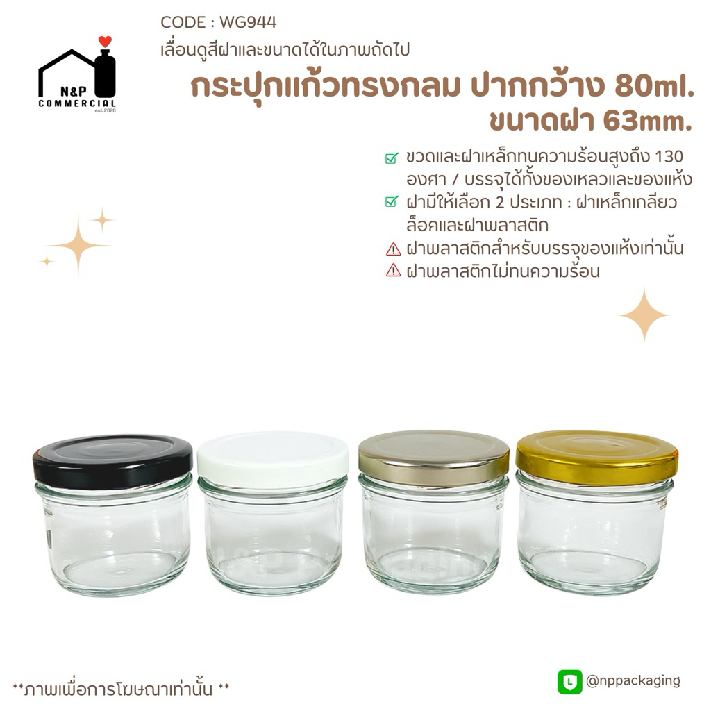 [WG-944] (แพ็ค 6 ใบ) กระปุกแก้วอาหารทรงกลมปากกว้าง 80ml. พร้อมฝา 63mm.
